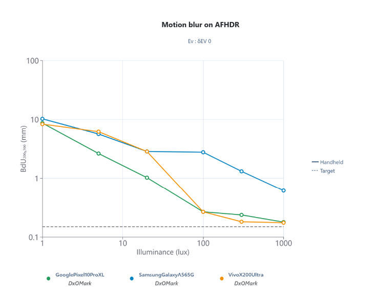 The update enhances measurements by taking into account the white point of the illuminant in each lab-tested scene, providing greater granularity and more precise evaluations for these two criteria. As a result, the quality of white balance and color rendering assessments is improved across a wide range of simulated lighting conditions in DXOMARK laboratories. According to our scoring methodology, if HDR is available in a publicly accessible or documented format, motion blur testing is conducted in HDR.