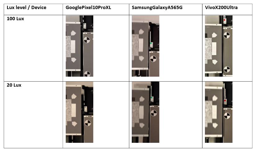Below are some examples of measurements and what can be observed in terms of motion blur in the images. The examples clearly show that Google and Vivo perform identically at 100 Lux, but not at 20 Lux. Similarly, at 20 Lux, the Vivo and Samsung behave similarly, as indicated by the measurement.