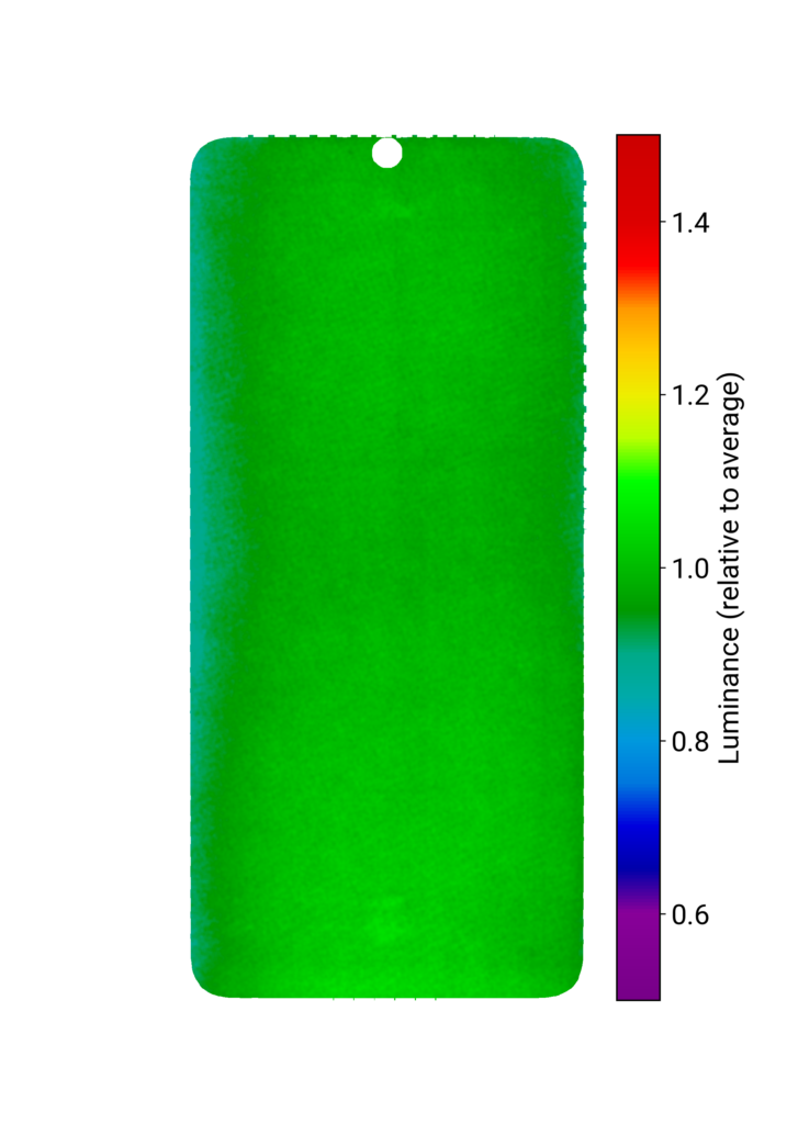 This graph shows the distribution of luminance throughout the entire display panel. Uniformity is measured with a 20% gray pattern, with bright green indicating ideal luminance. An evenly spread-out bright green color on the screen indicates that the display’s brightness is uniform. Other colors indicate a loss of uniformity.
