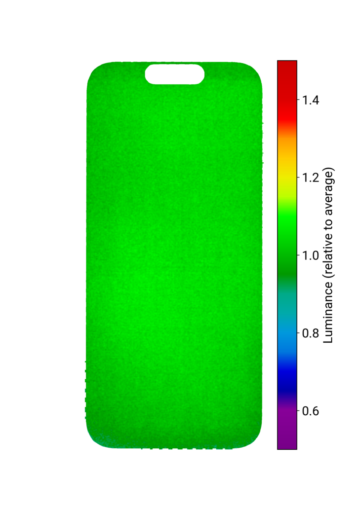 This graph shows the distribution of luminance throughout the entire display panel. Uniformity is measured with a 20% gray pattern, with bright green indicating ideal luminance. An evenly spread-out bright green color on the screen indicates that the display’s brightness is uniform. Other colors indicate a loss of uniformity.