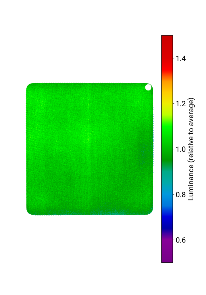 This graph shows the distribution of luminance throughout the entire display panel. Uniformity is measured with a 20% gray pattern, with bright green indicating ideal luminance. An evenly spread-out bright green color on the screen indicates that the display’s brightness is uniform. Other colors indicate a loss of uniformity.